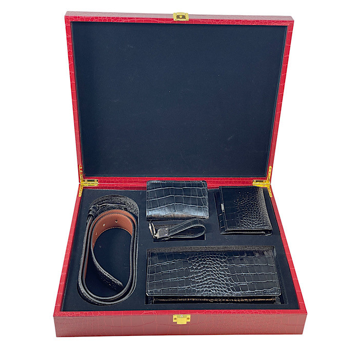 ست پنج تیکه چرم گاوی کیف کتی/ جاکارتی/ کیف پول جیبی/جاکلیدی/ کمربند همراه جعبه شیک و باکیفیت mdf قفل دار که زیبایی این ست را دوچندان کرده است